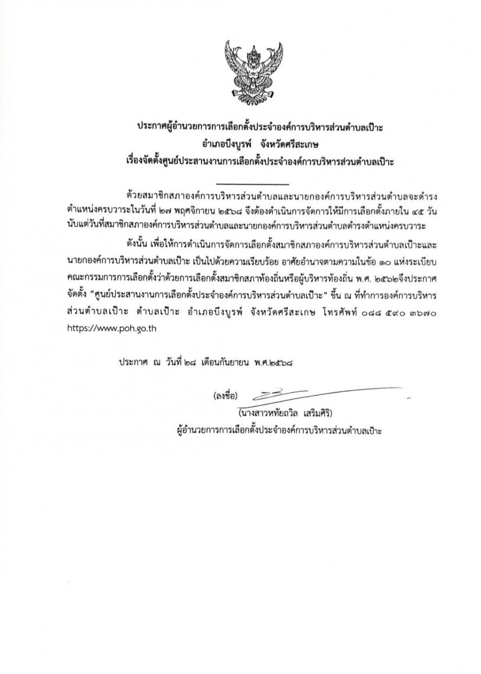 เรื่อง จัดตั้งศูนย์ประสานงานการเลือกตั้งประจำองค์การบริหารส่วนตำบลเป๊าะ