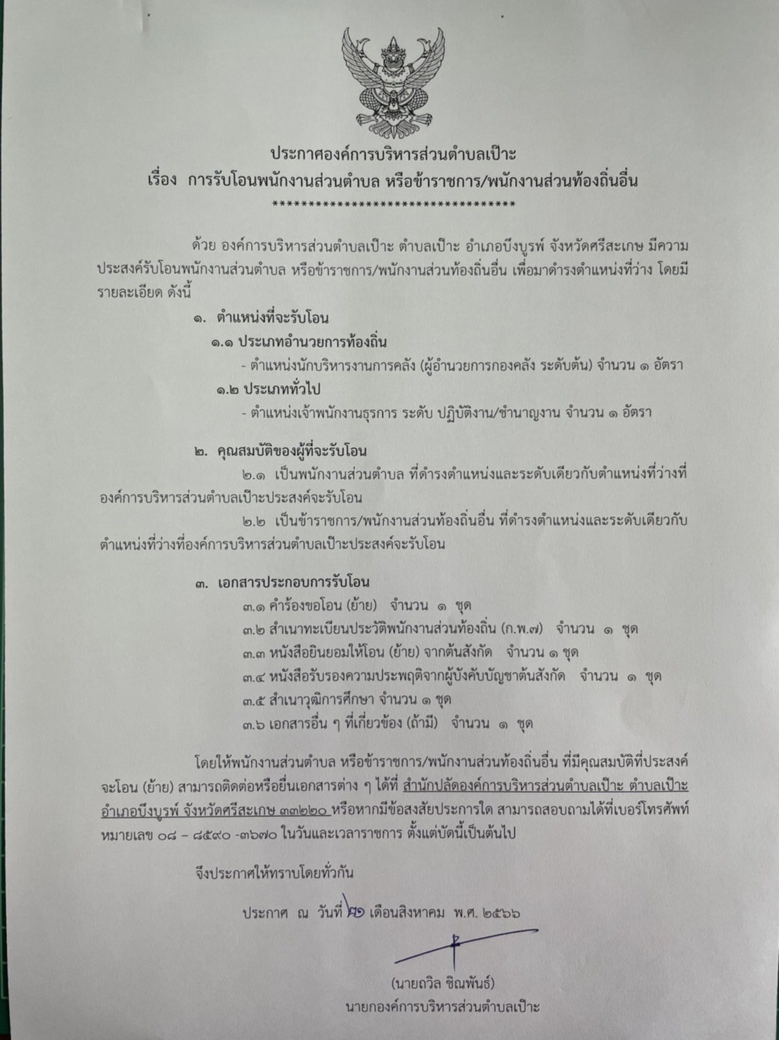 เรื่อง การรับโอนพนักงานส่วนตำบล หรือข้าราชการ/พนักงานส่วนท้องถิ่น