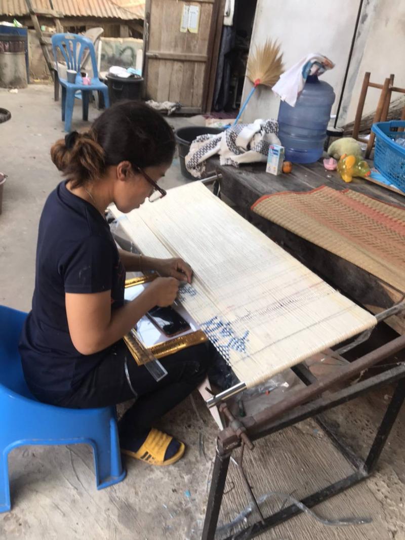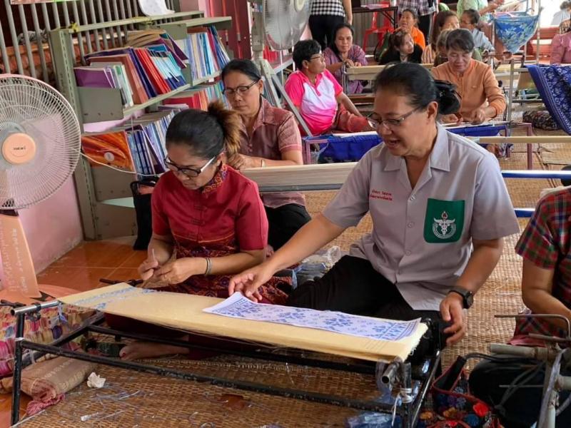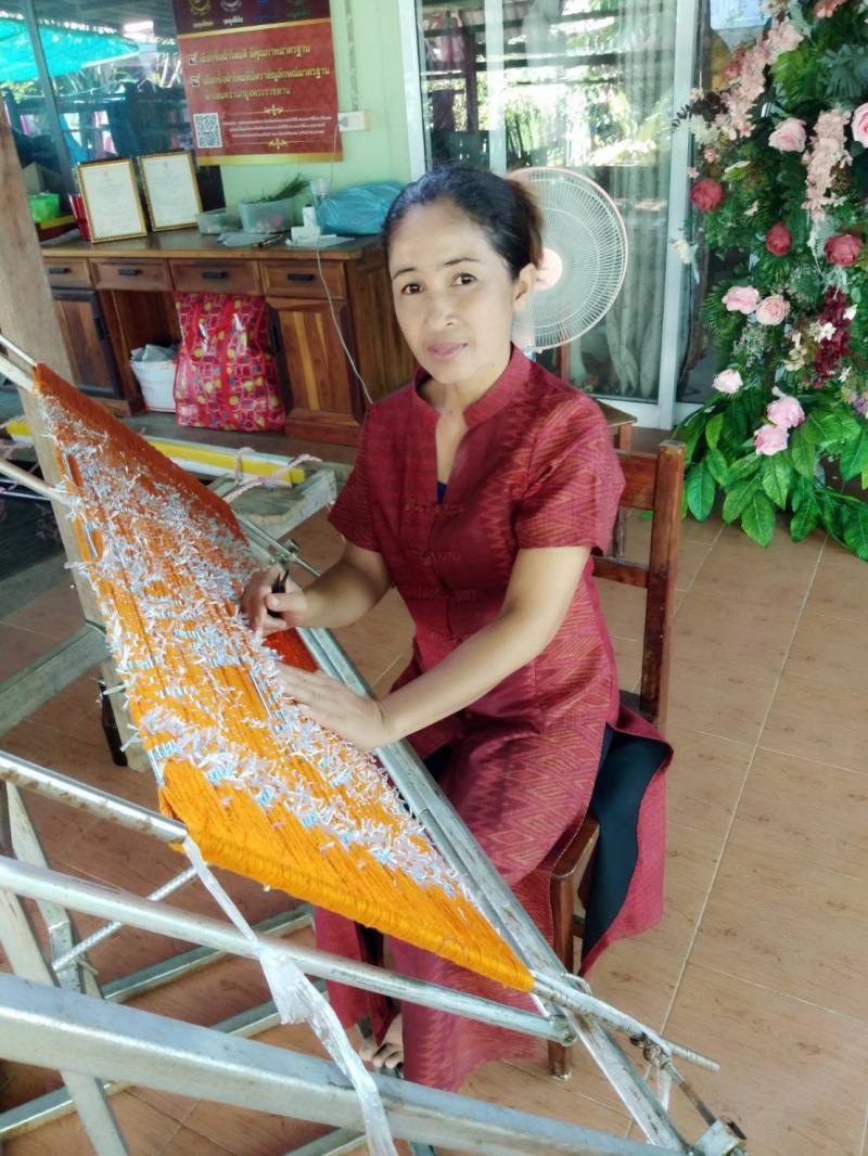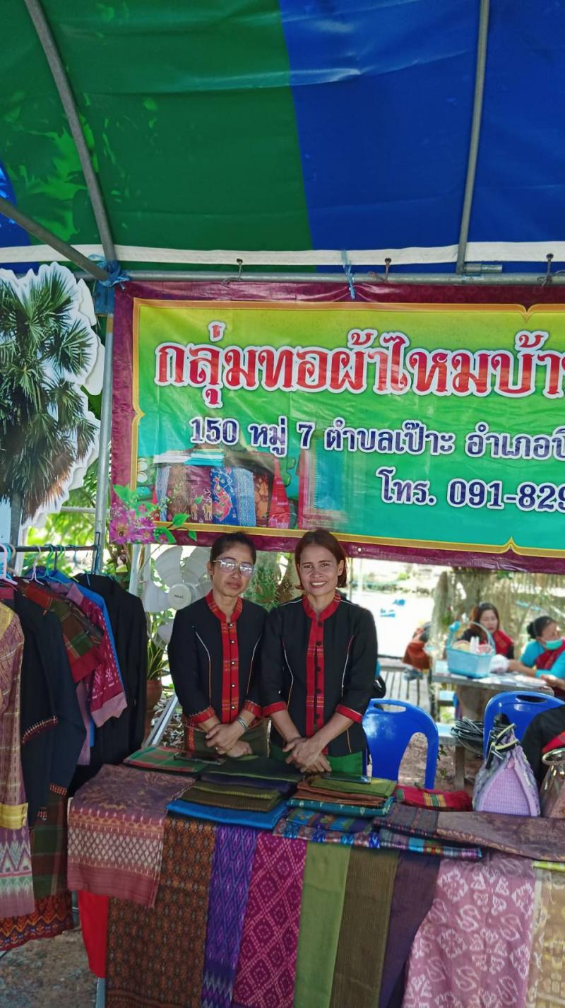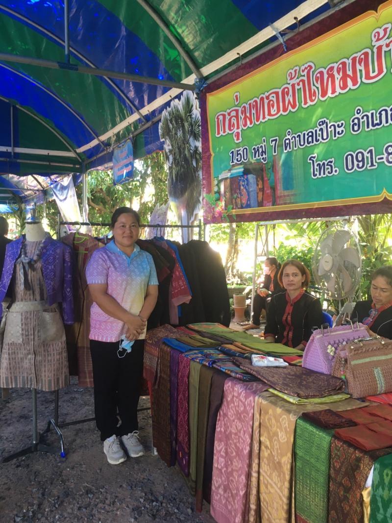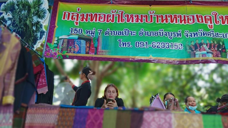 จำหน่วยสินค้าผลิตภัณฑ์ผ้าไหมมัดหมี่ ของกลุ่มทอผ้าไหมบ้านหนองคูใหญ่หมู่ที่ 7